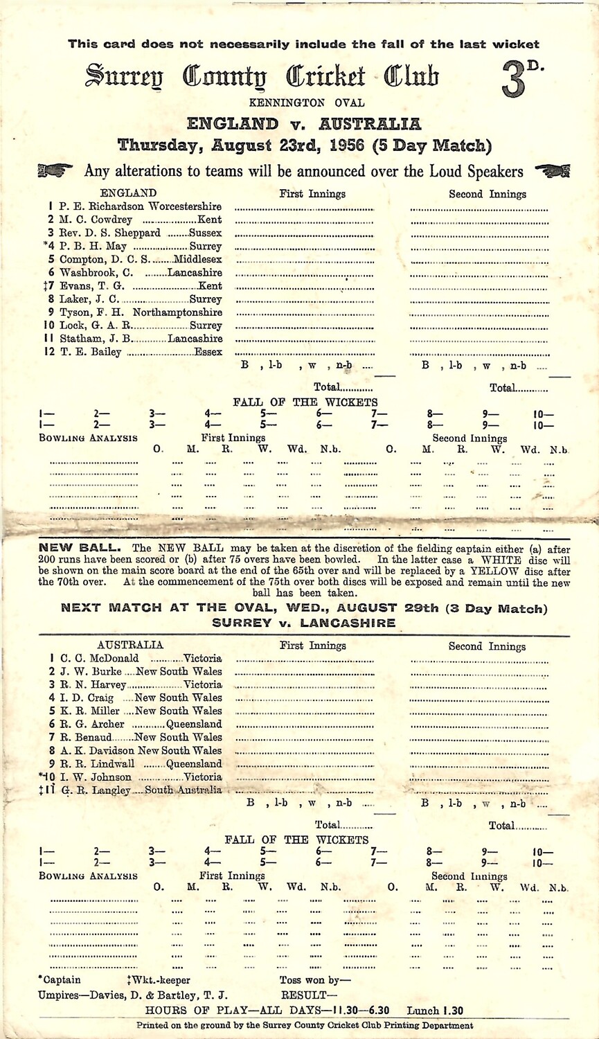1956 England v Australia 5th Test Match (23/08/1956) Cricket Scorecard