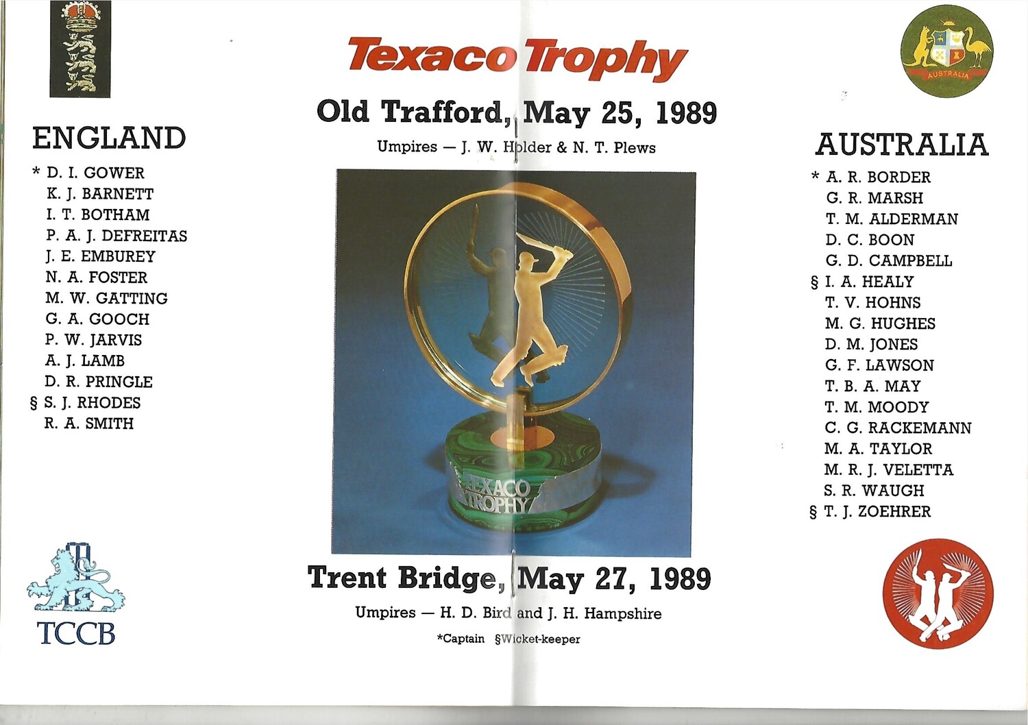 1989 England v Australia Texaco Trophy (25/05/1989 & 27/05/1989) Official Souvenir Cricket Programme