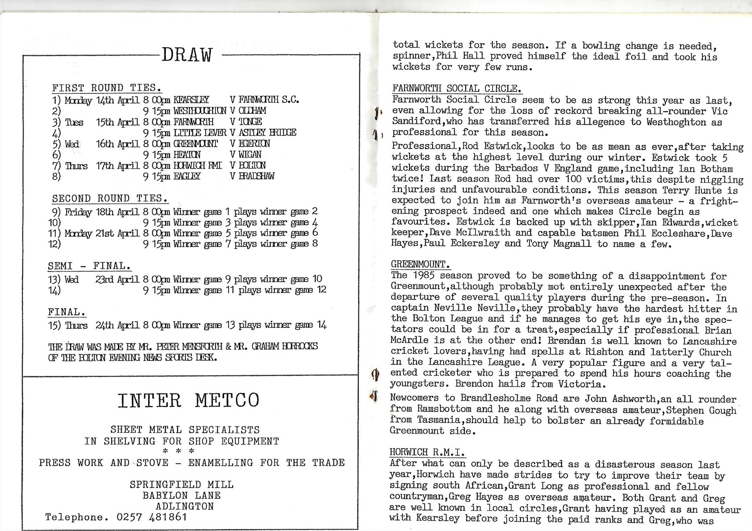 1986 Youngers Floodlit Cricket Championship Cricket Programme