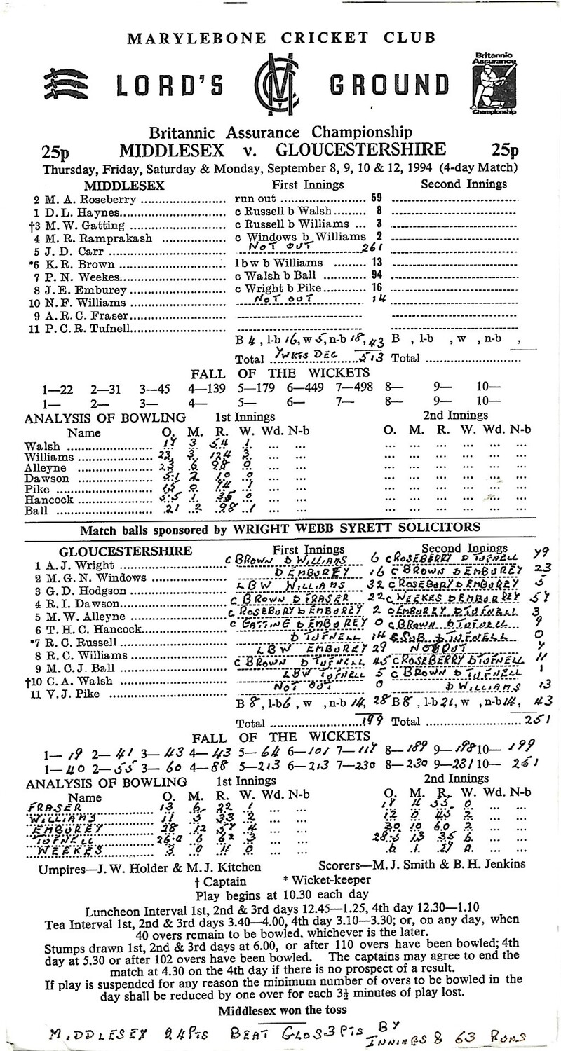 1994 Middlesex v Gloucestershire Britannic Assurance County Championship Match (08, 09, 10, 12/09/1994) Cricket Scorecard