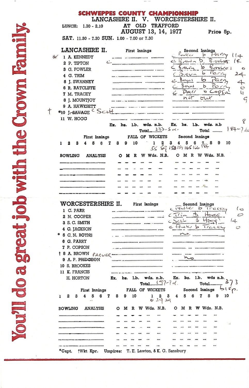 1977 Lancashire II v Worcestershire II County Match (13-14/08/1977) Cricket Scorecrad