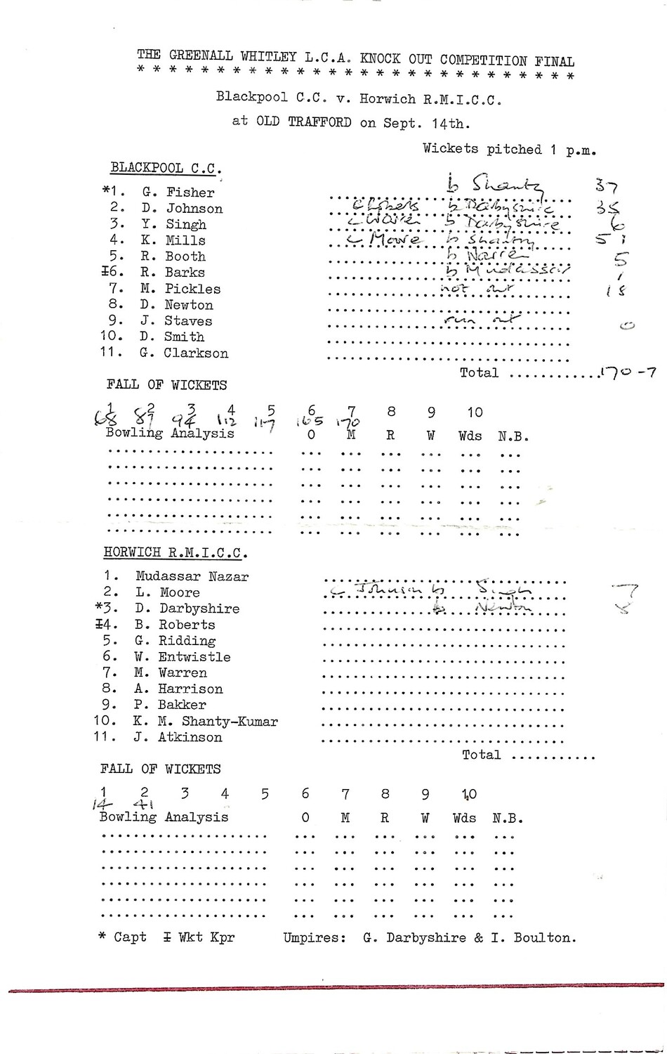 1980 Blackpool v Horwich The Greenall Whitley Lancashire Cricket Association Knockout Competition Final (14/09/1980) Cricket Scorecard