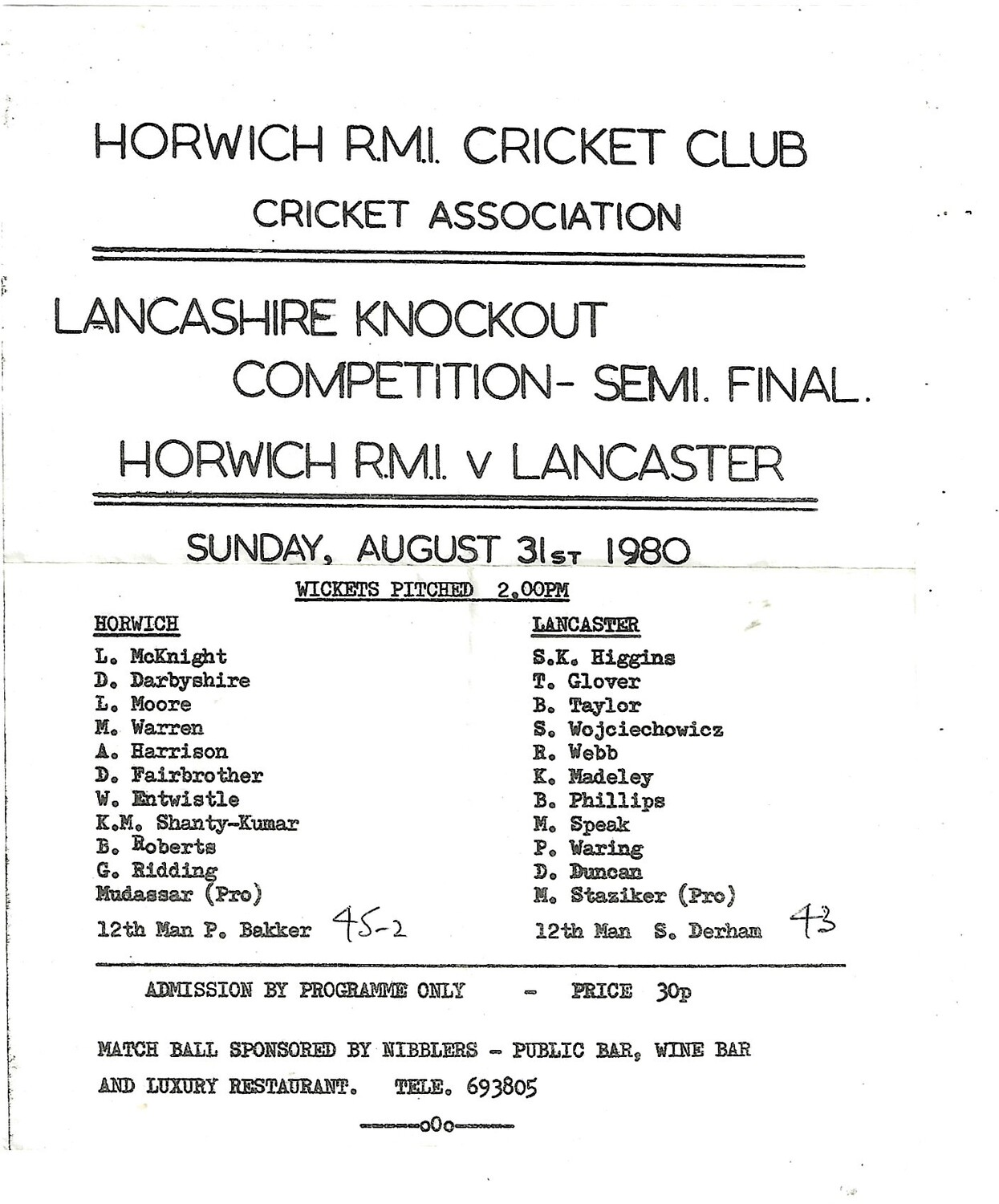 1980 Horwich v Lancaster Lancashire Knockout Competition Semi-Final (31/08/1980) Cricket Programme