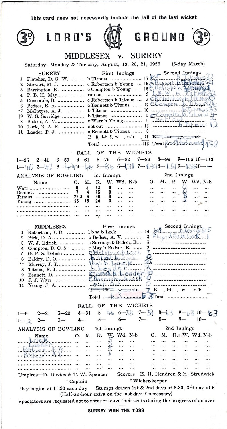 1956 Middlesex v Surrey County Match (18, 20,21/08/1956) Cricket Scorecard