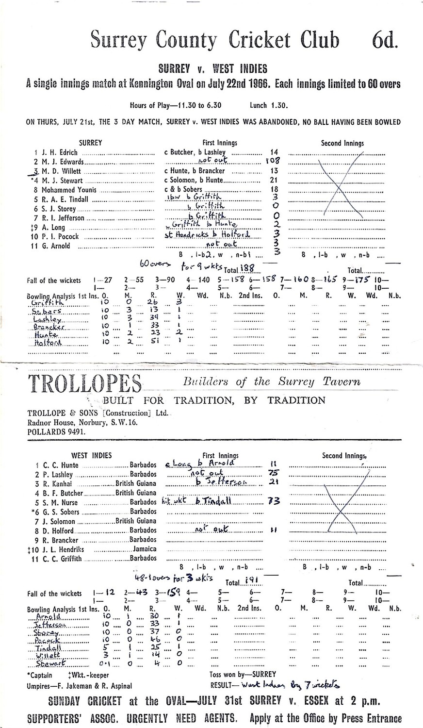1966 Surrey v West Indies One Day Match (22/07/1966) Cricket Scorecard