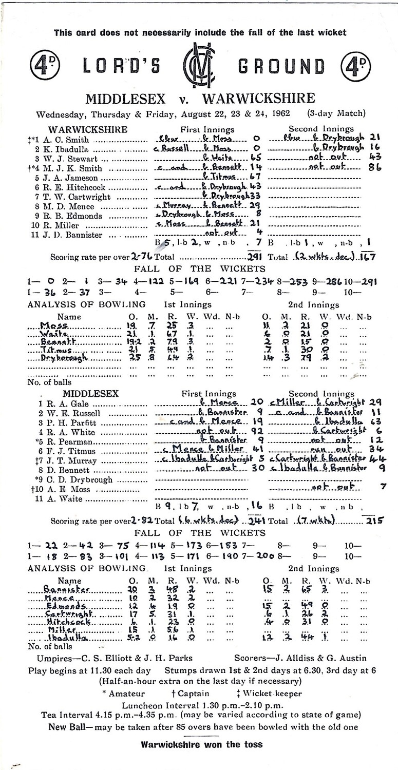 1962 Middlesex v Warwickshire County Match (22-24/08/1962) Cricket Scorecard