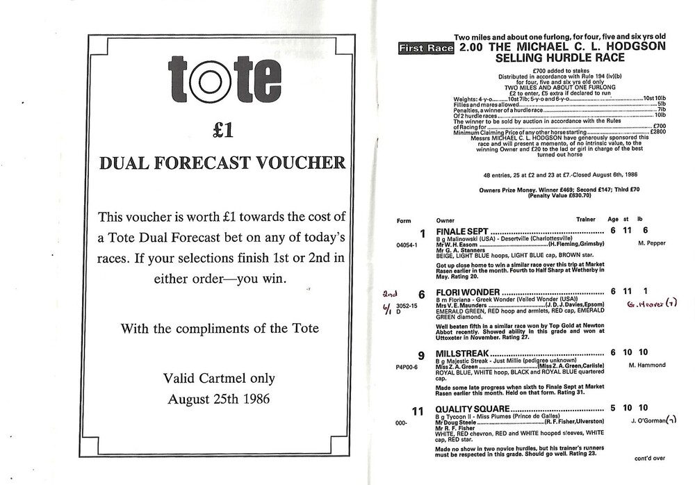 1986 Cartmel Summer Bank Holiday Meeting (25/08/1986) Horse Racing Racecard