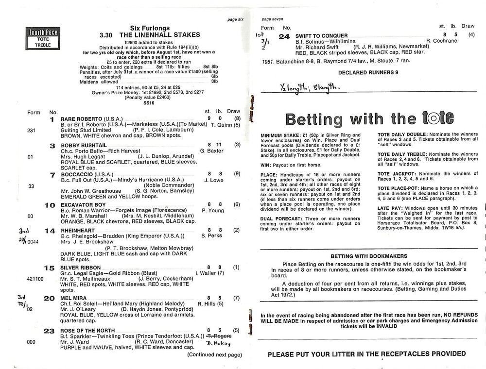 Slight creasing, discolouration, rusty staples, annotation in ink on runners/riders pages. (as per photo).