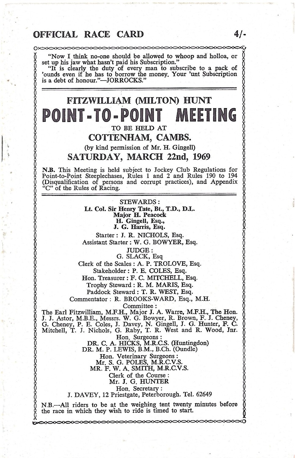 1969 Cottenham Fitzwilliam Point To Point Meeting (22/03/1969) Horse Racing Racecard