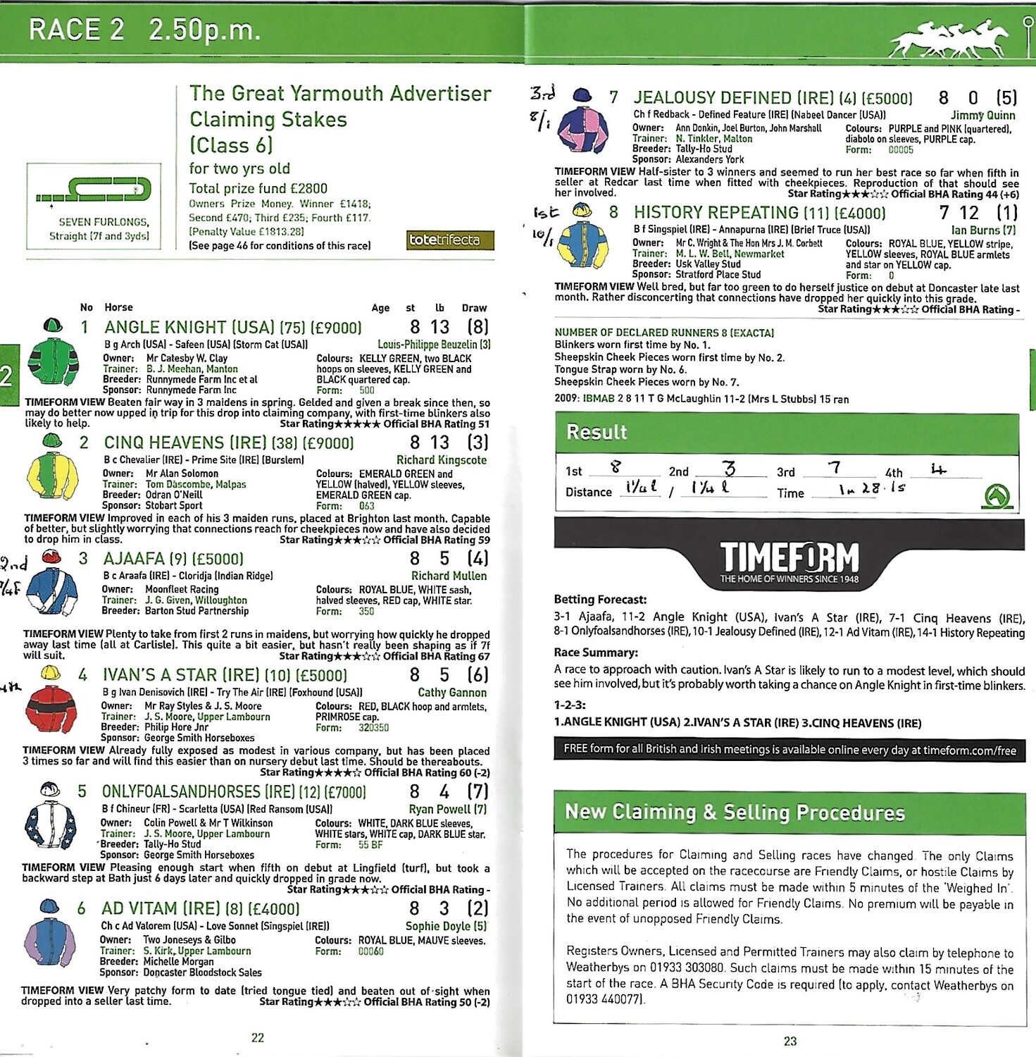 Slight creasing, discolouration, annotation in ink on runners/riders pages. (as per photo).