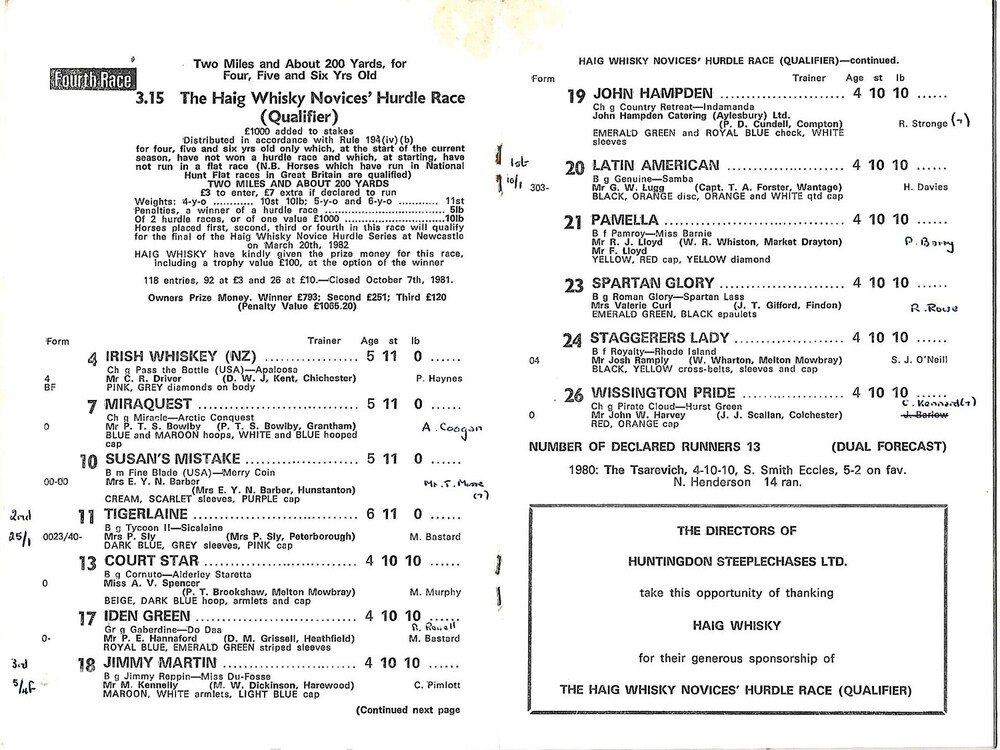 1981 Huntingdon October Race Meeting (24/10/1981) Horse Racing Racecard