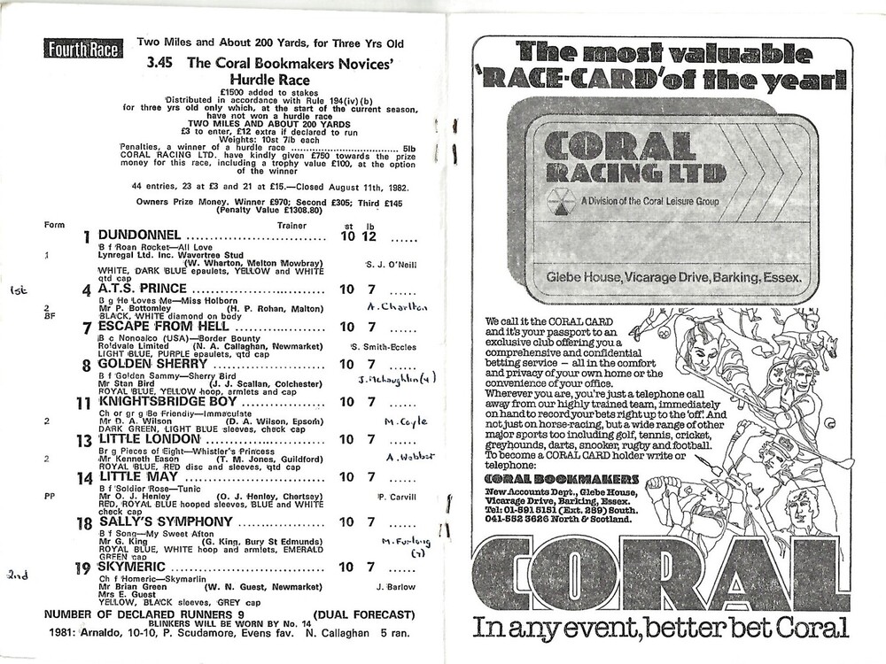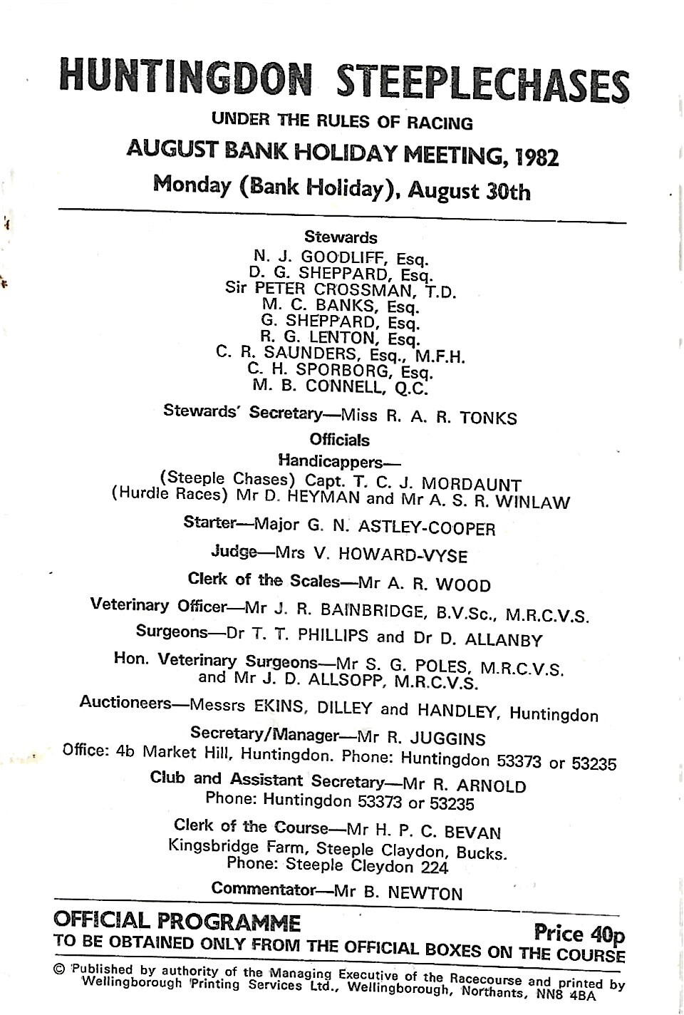 1982 Huntingdon August Bank Holiday Race Meeting (30/08/1982) Horse Racing Racecard