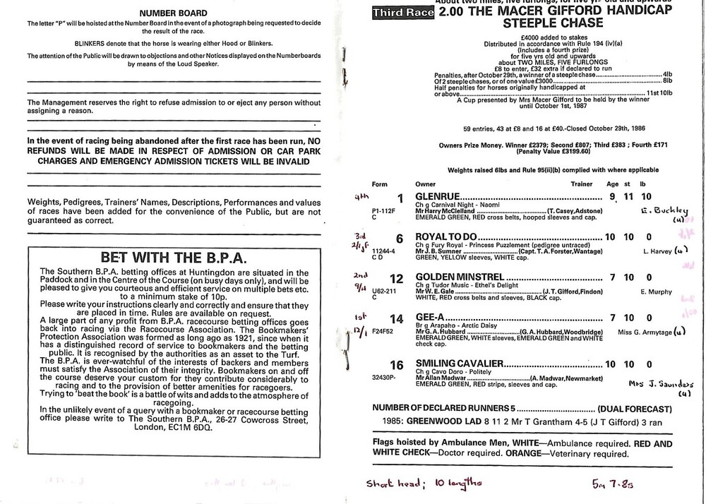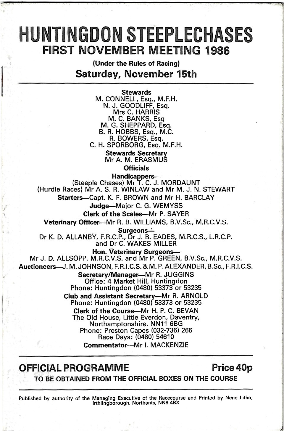 1986 Huntingdon First November Meeting (15/11/1986) Horse Racing Racecard