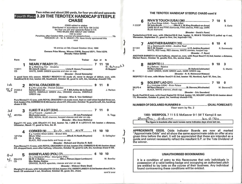1990 Huntingdon October Race Meeting (27/10/1990) Horse Racing Racecard
