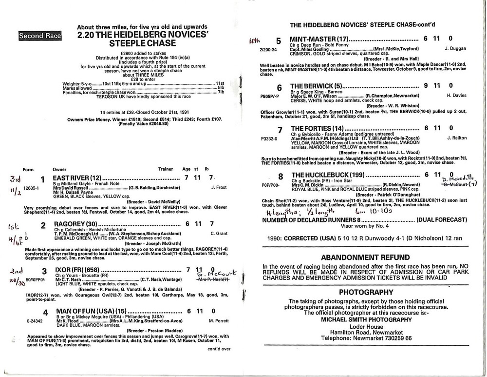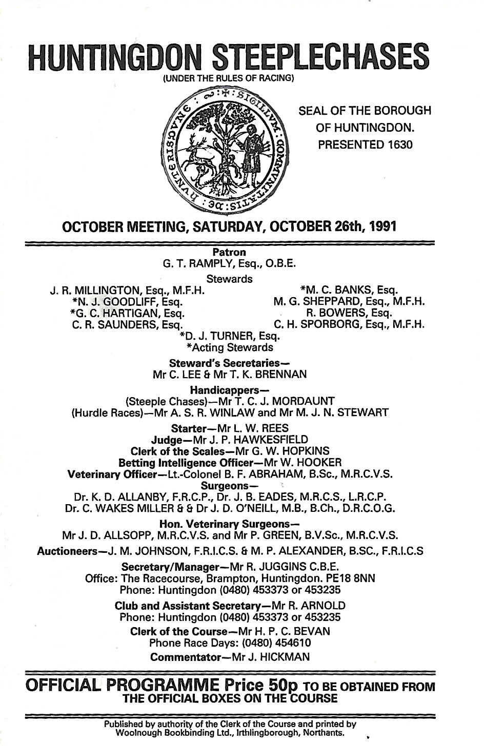 1991 Huntingdon October Race Meeting (26/10/1991) Horse Racing Racecard