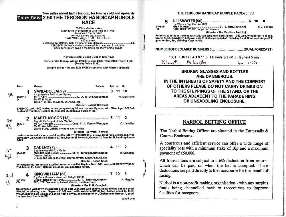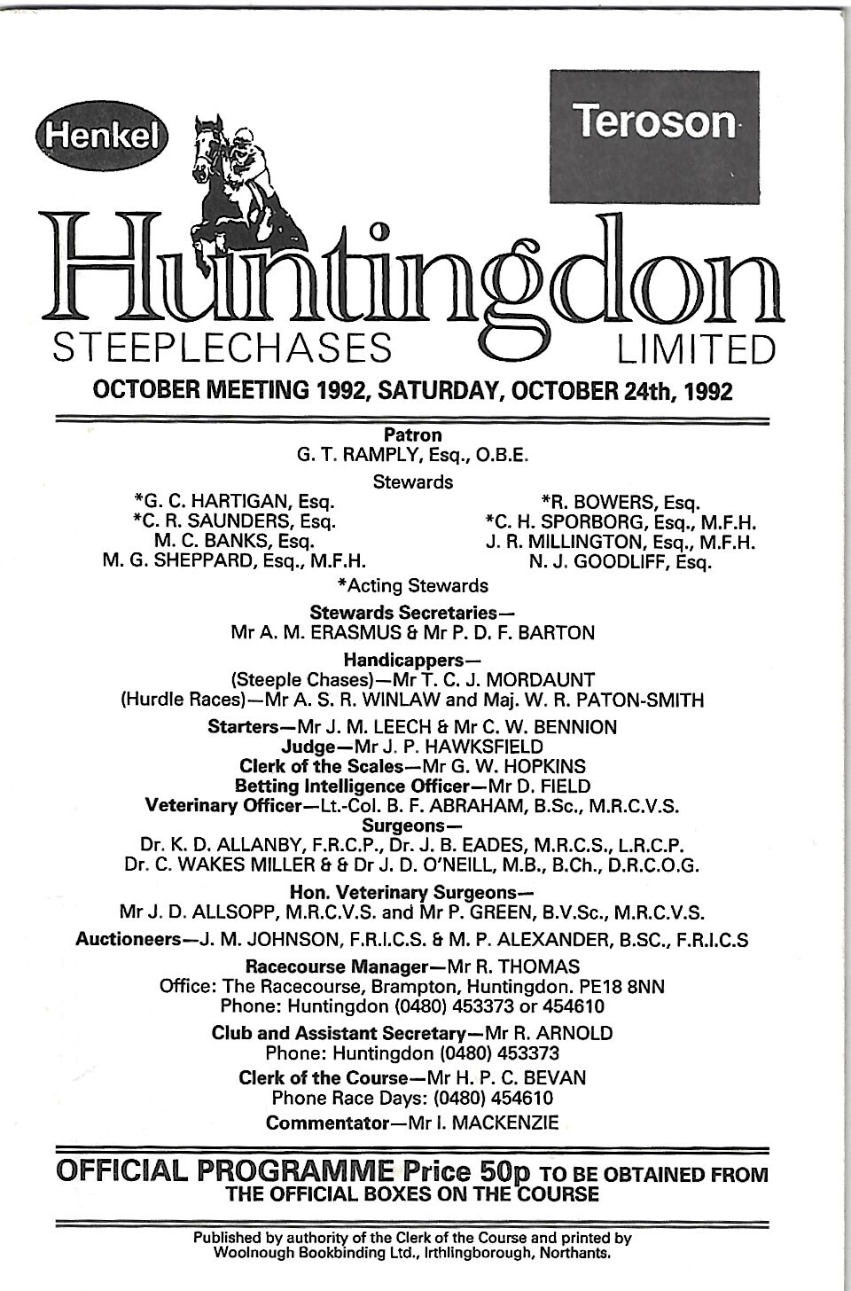 1992 Huntingdon October Race Meeting (24/10/1992) Horse Racing Racecard