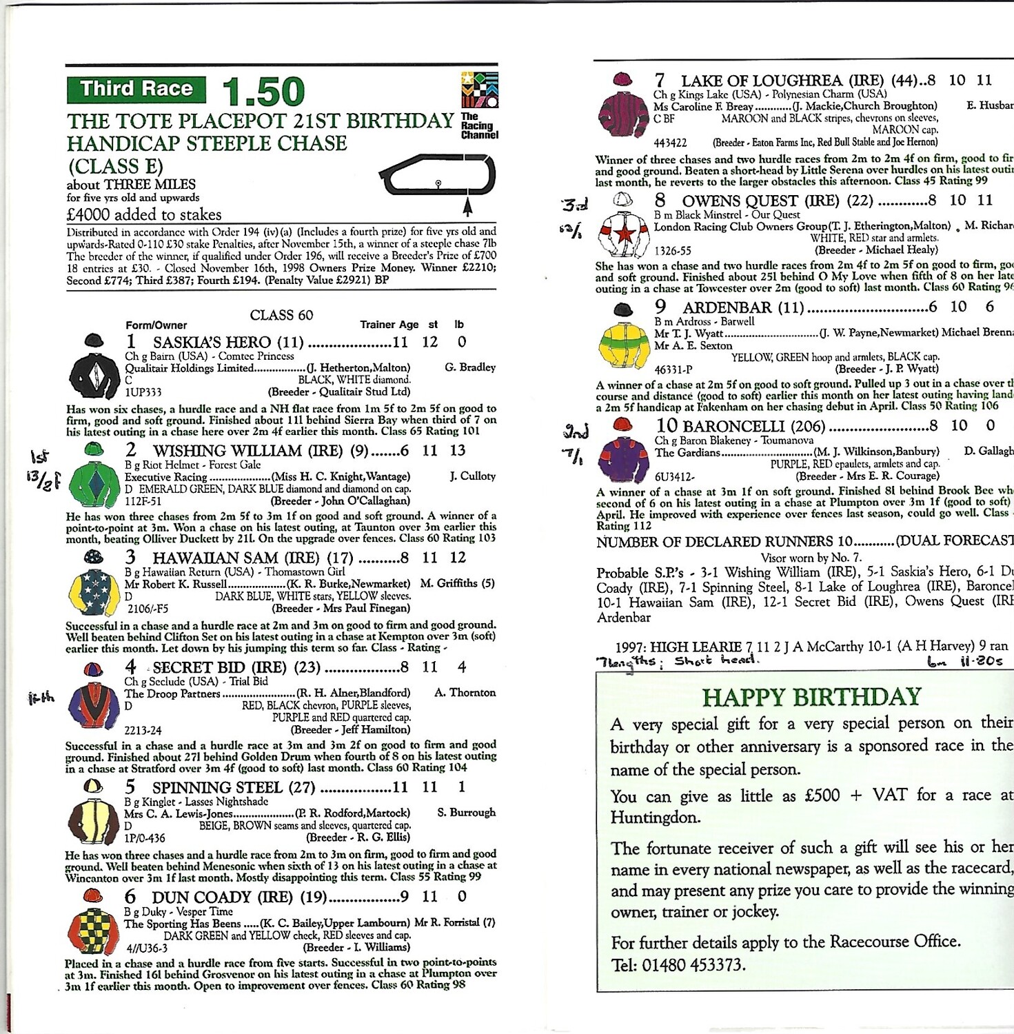 1998 Huntingdon Second November Race Meeting (21/11/1998) Horse Racing Racecard