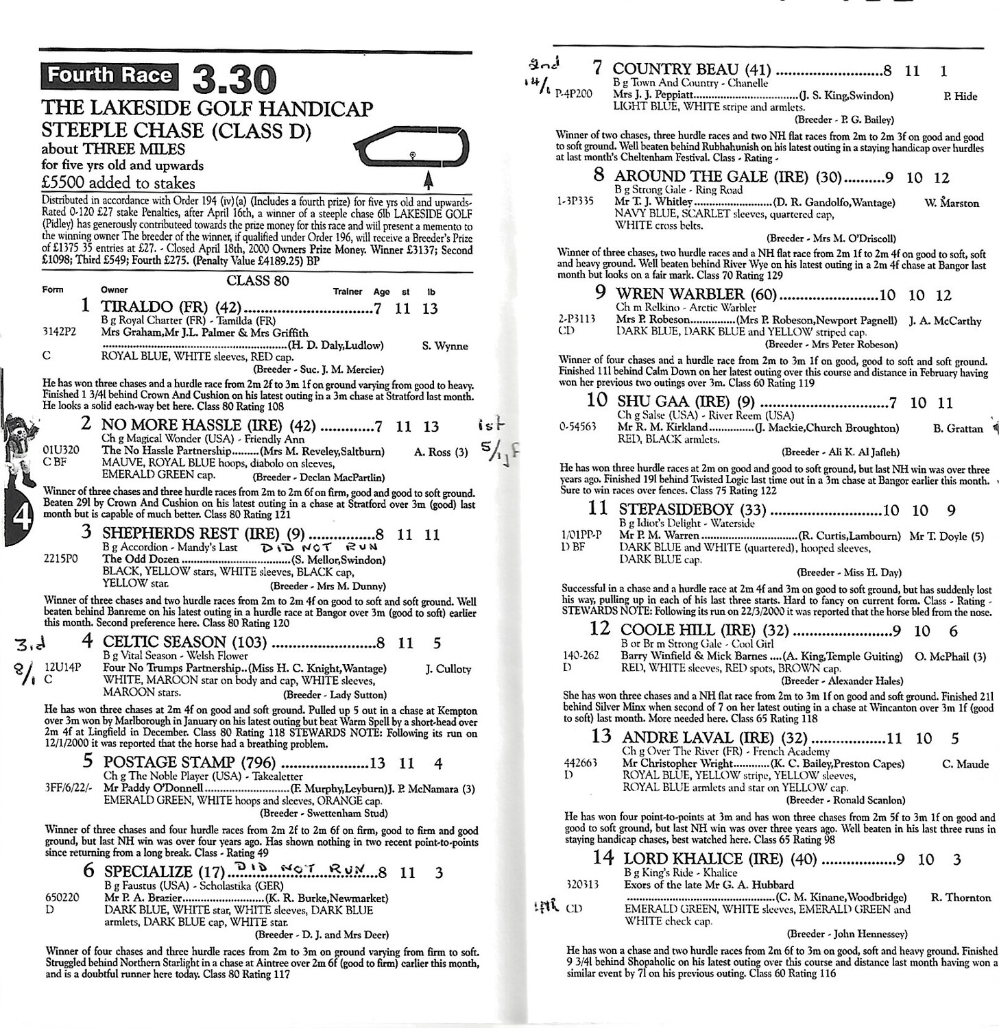 Slight creasing, discolouration, rusty staples, annotation in ink on runners/riders pages. (as per photo).