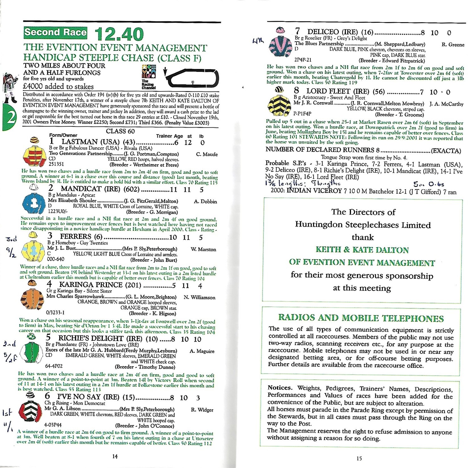 2001 Huntingdon The BBA Peterborough Chase Race Meeting (24/11/2001) Horse Racing Racecard
