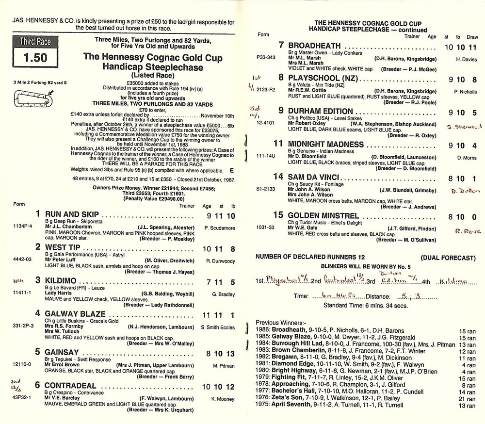 1987 Newbury Hennessey Gold Cup Meeting (28/11/1987) Horse Racing Racecard