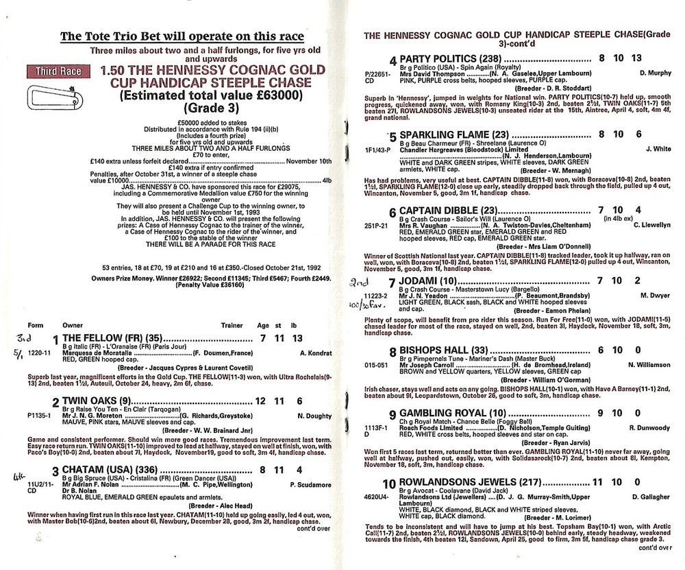 1992 Newbury Hennessey Gold Cup Meeting (28/11/1992) Horse Racing Racecard