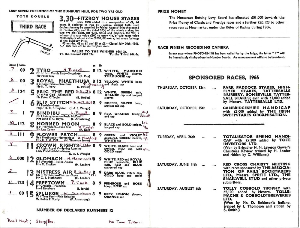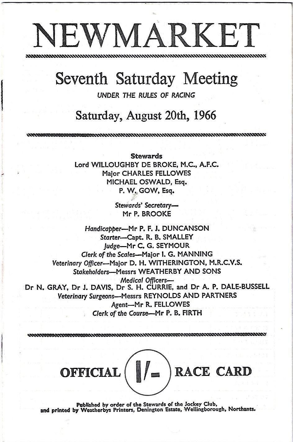1966 Newmarket Seventh Saturday Race Meeting (20/08/1966) Horse Racing Racecard
