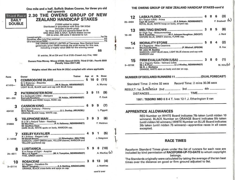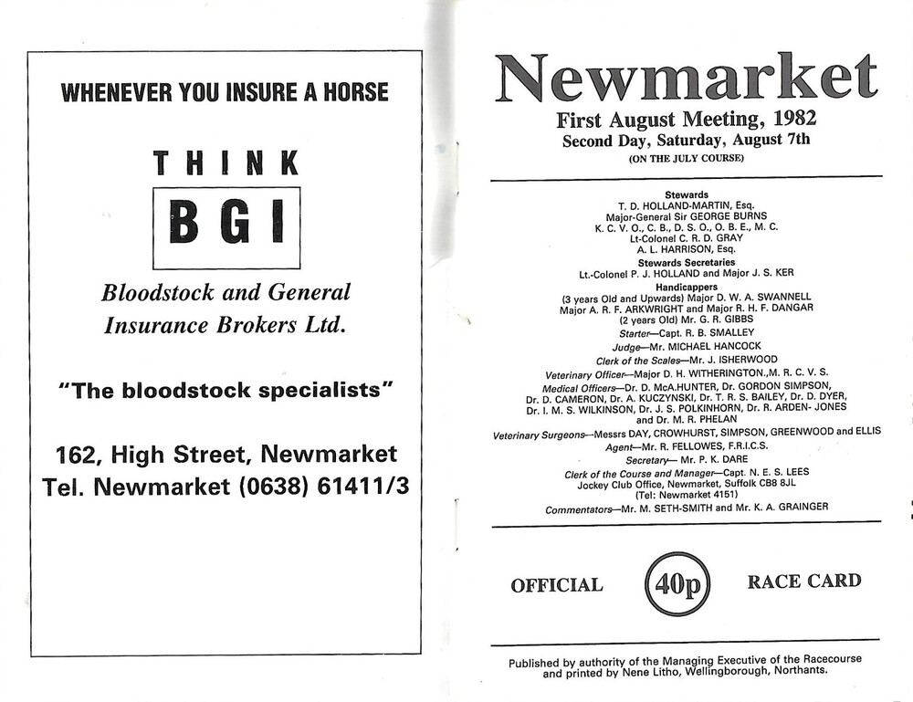 1982 Newmarket First August Race Meeting (07/08/1982) Horse Racing Racecard