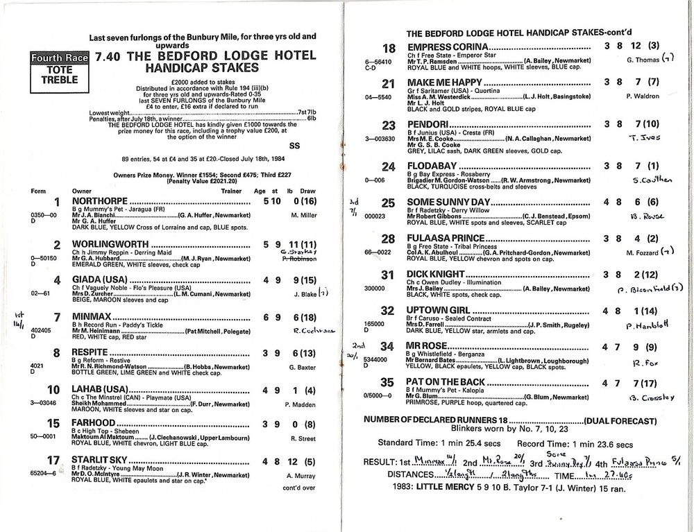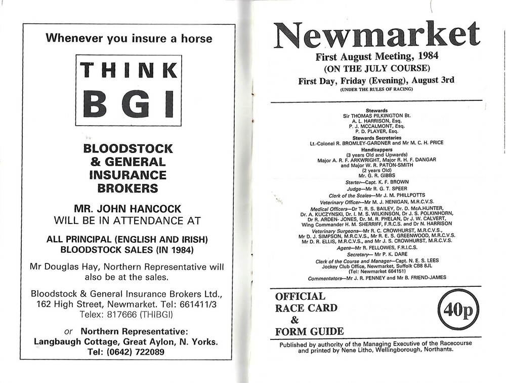 1984 Newmarket First August Race Meeting (03/08/1984) Horse Racing Racecard