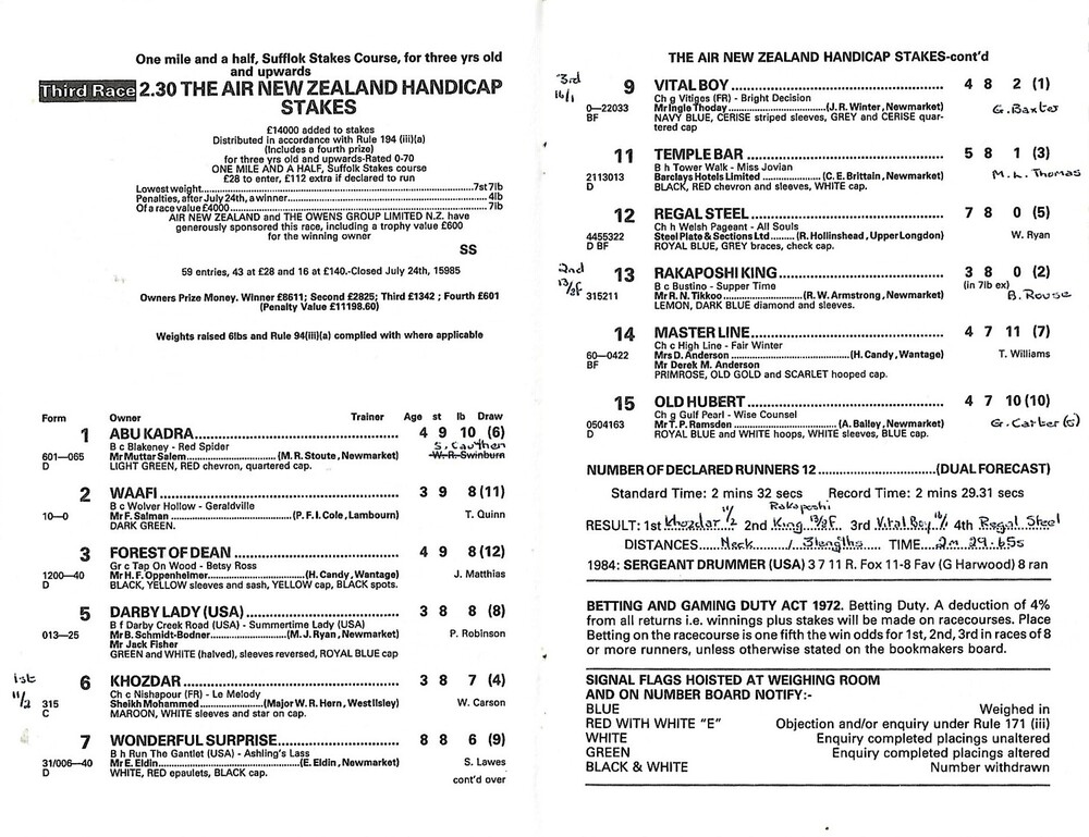 1985 Newmarket Second August Meeting (New Zealand Day) (10/08/1985) Horse Racing Racecard