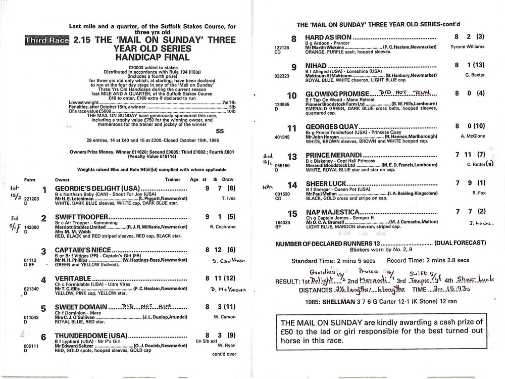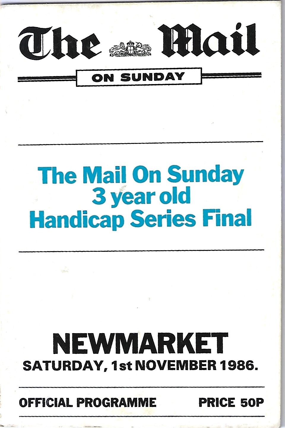 1986 Newmarket November Meeting (The Mail On Sunday 3 Year Old Handicap Series Final) Race Meeting (01/11/1986) Horse Racing Racecard