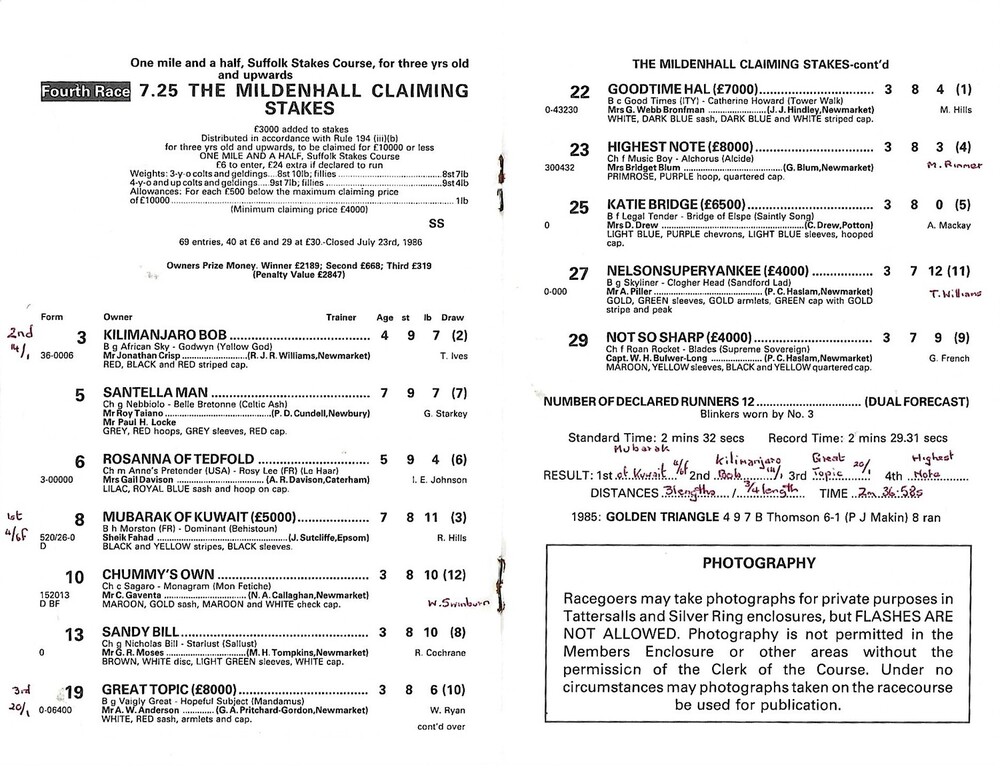 1986 Newmarket Second August Race Meeting (08/08/1986) Horse Racing Racecard
