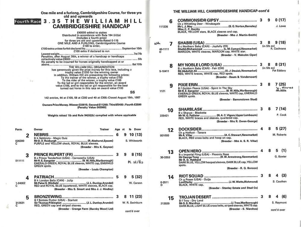 1987 Newmarket October Meeting (The William Hill Cambridgeshire Handicap) Race Meeting (03/10/1987) Horse Racing Racecard