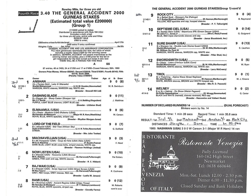 1990 Newmarket The General Accident Spring Meeting (2,000 Guineas Stakes) Race Meeting (05/05/1990) Horse Racing Racecard