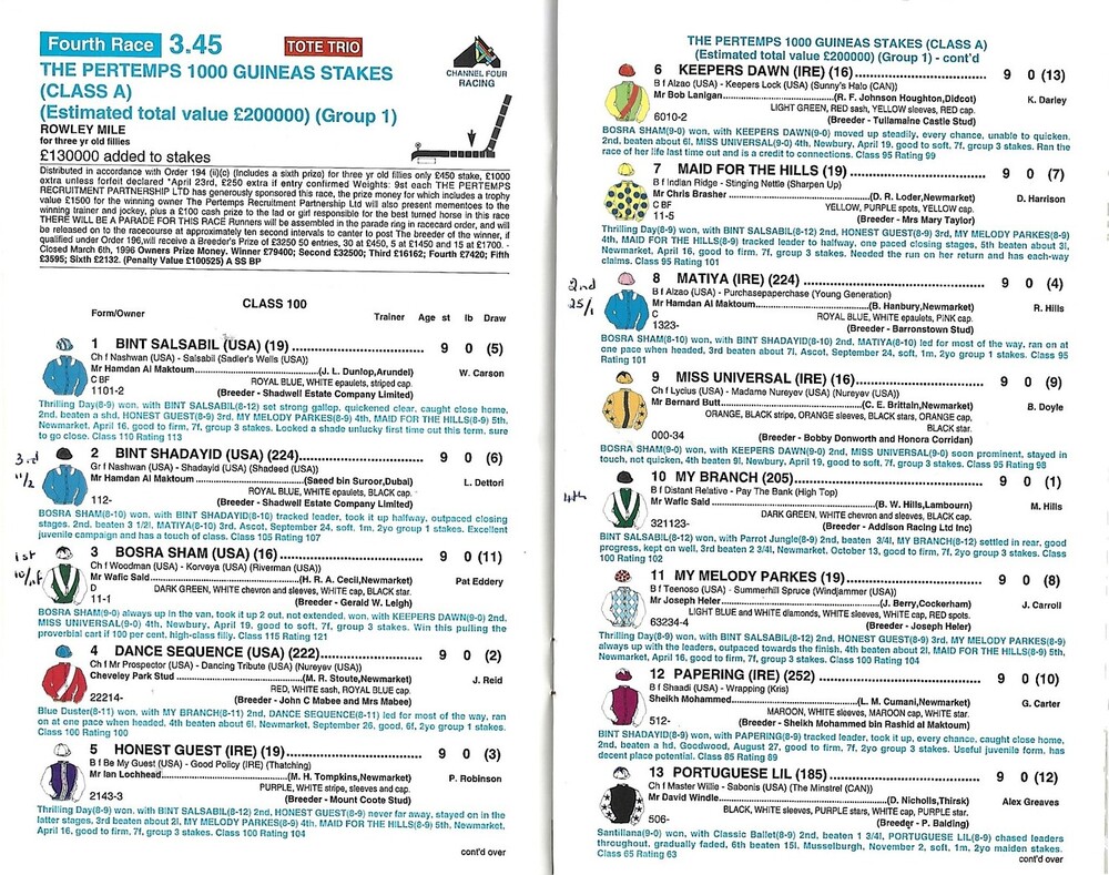1996 Newmarket Pertemps Guineas Festival Meeting (The Pertemp's 1,000 Guineas Stakes) Race Meeting (05/05/1996) Horse Racing Racecard