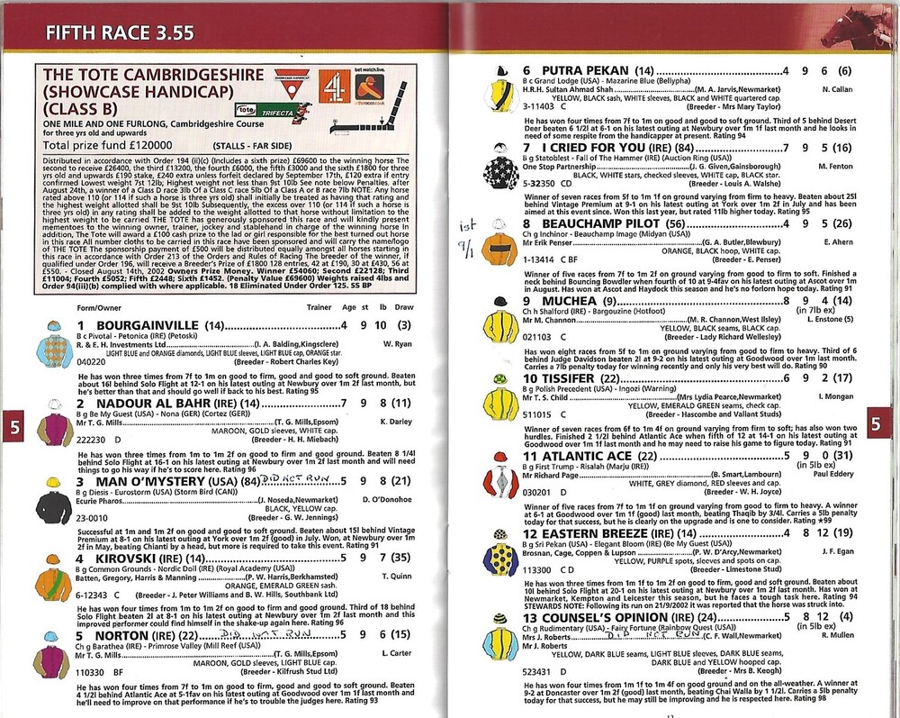 2002 Newmarket Cambridgeshire Meeting (The Tote Cambridgeshire Handicap) Race Meeting (05/10/2002) Horse Racing Racecard