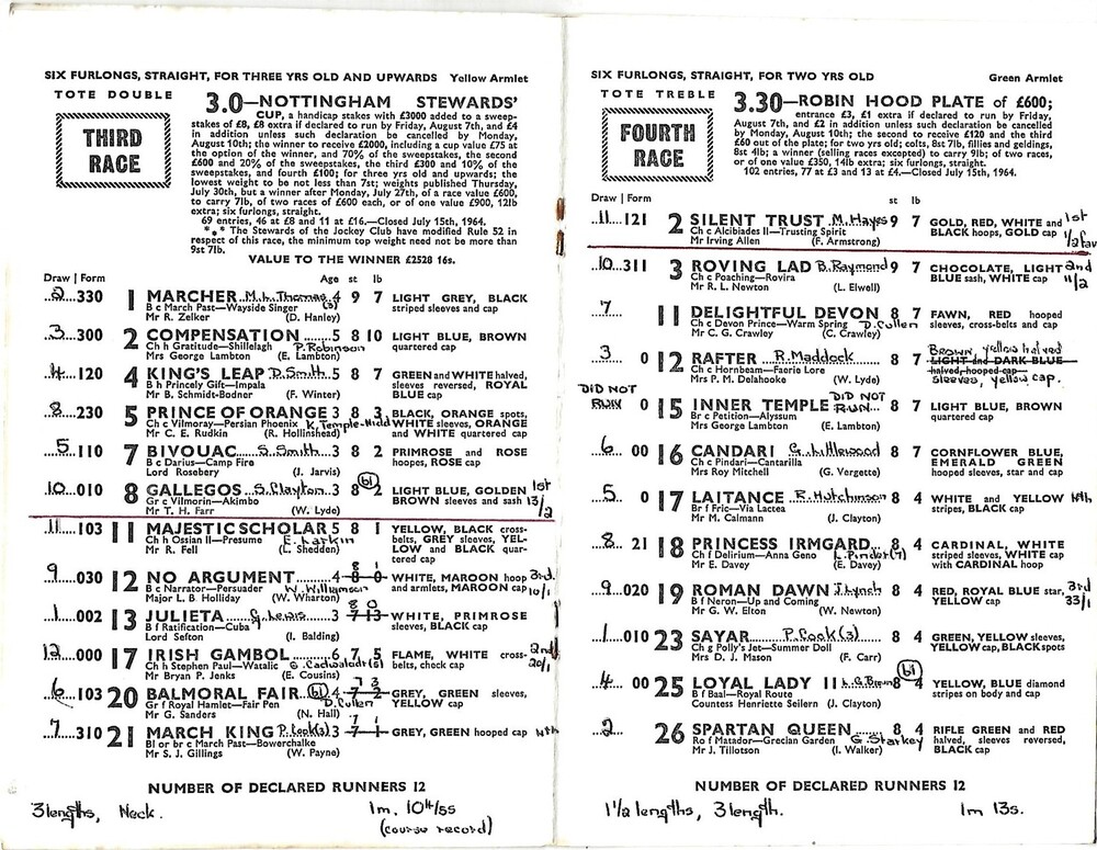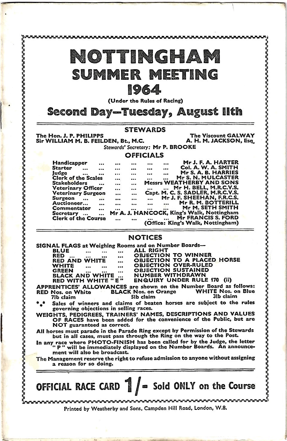 1964 Nottingham Summer Meeting (11/08/1964) Horse Racing Racecard