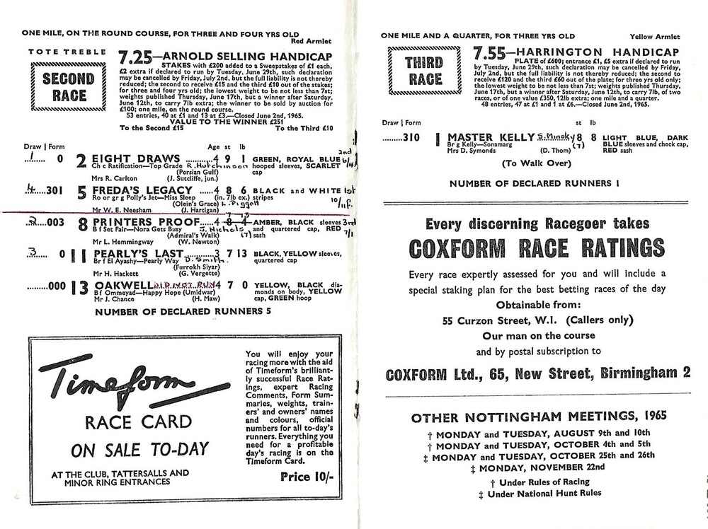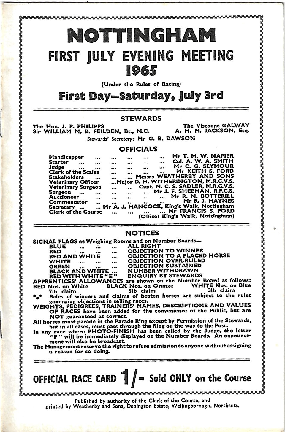 1965 Nottingham First July Evening Meeting (03/07/1965) Horse Racing Racecard