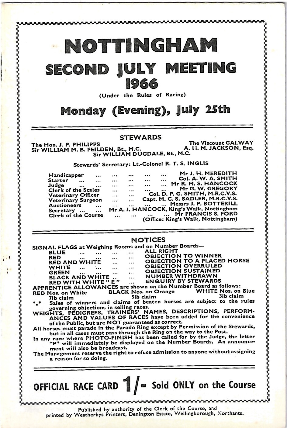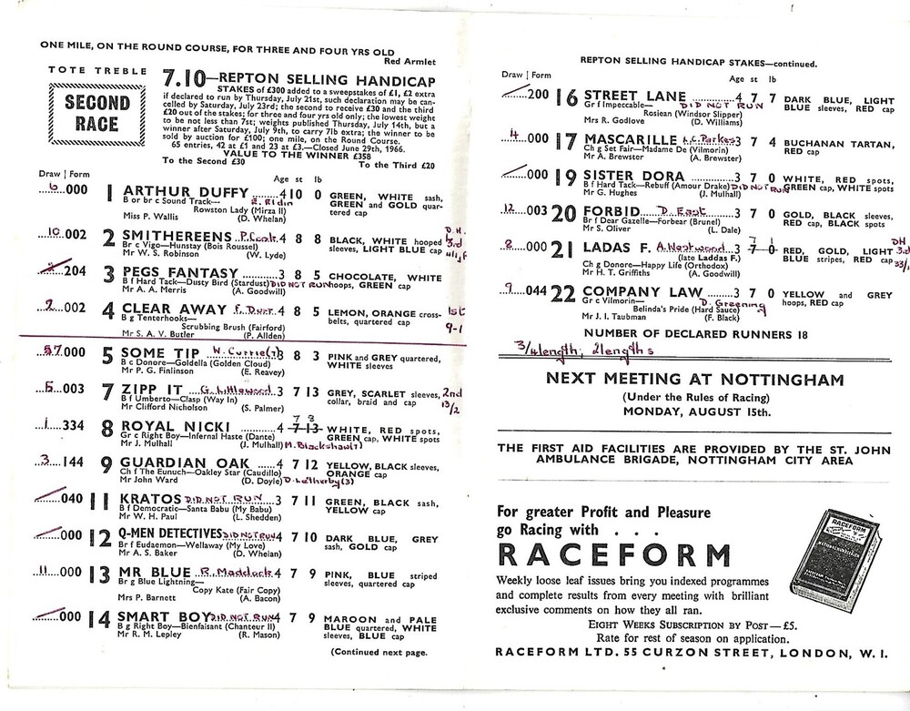 1966 Nottingham Second July Evening Meeting (25/07/1966) Horse Racing Racecard