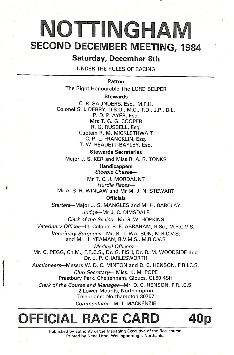 1984 Nottingham Second December Meeting (08/12/1984) Horse Racing Racecard