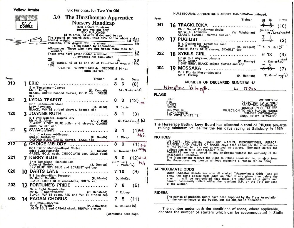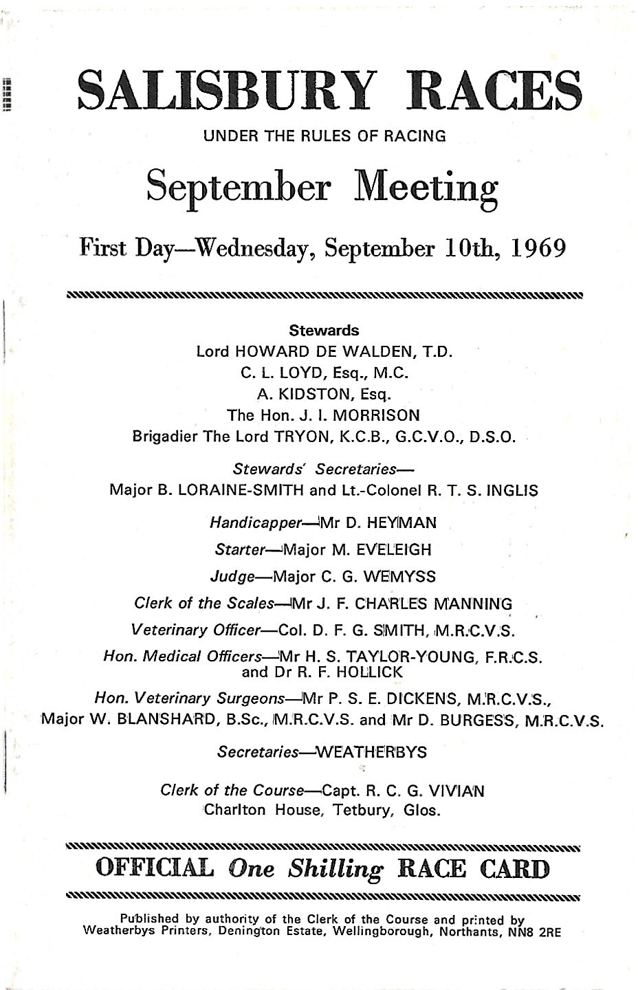1969 Salisbury September Meeting (10/09/1969) Horse Racing Racecard