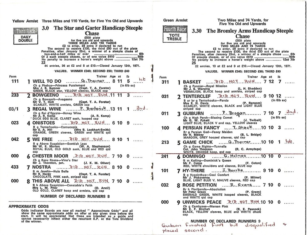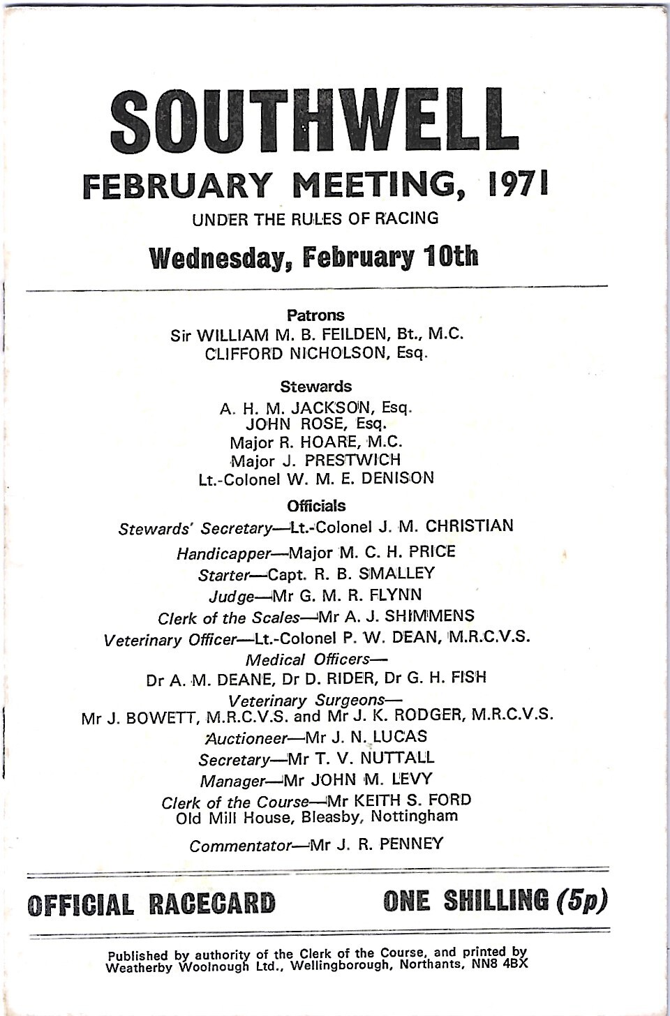 1971 Southwell February Meeting (10/02/1971) Horse Racing Racecard