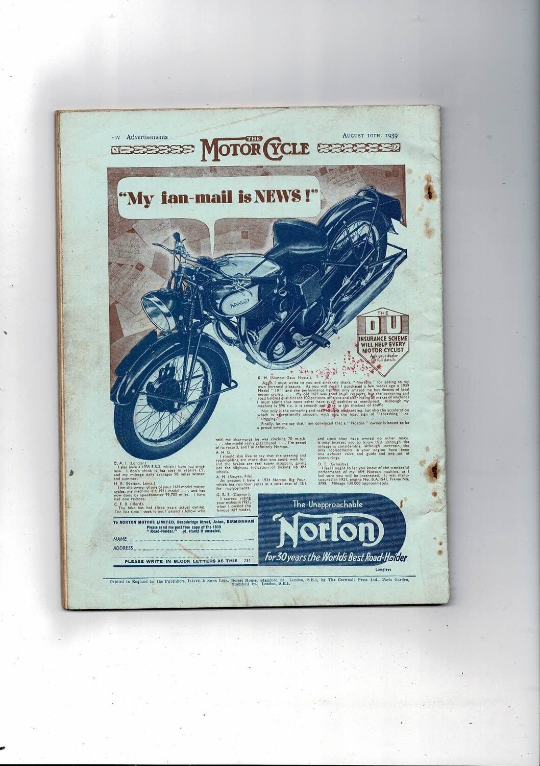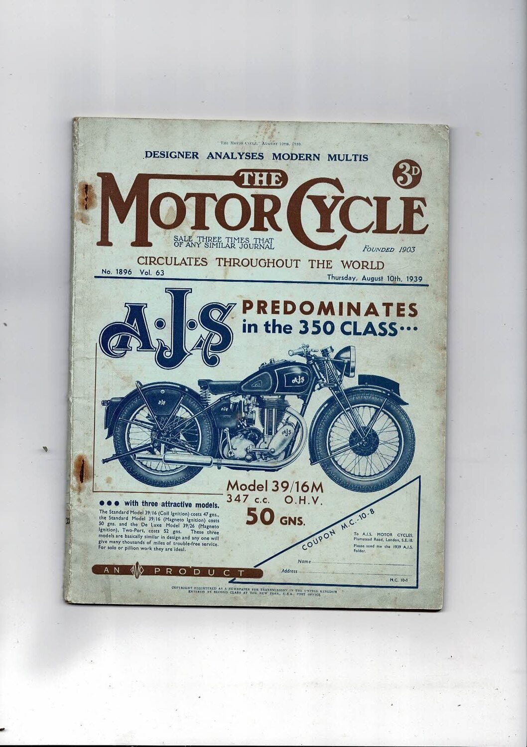 1939 The Motor Cycle Magazine 10th August Vol 63 No 1896