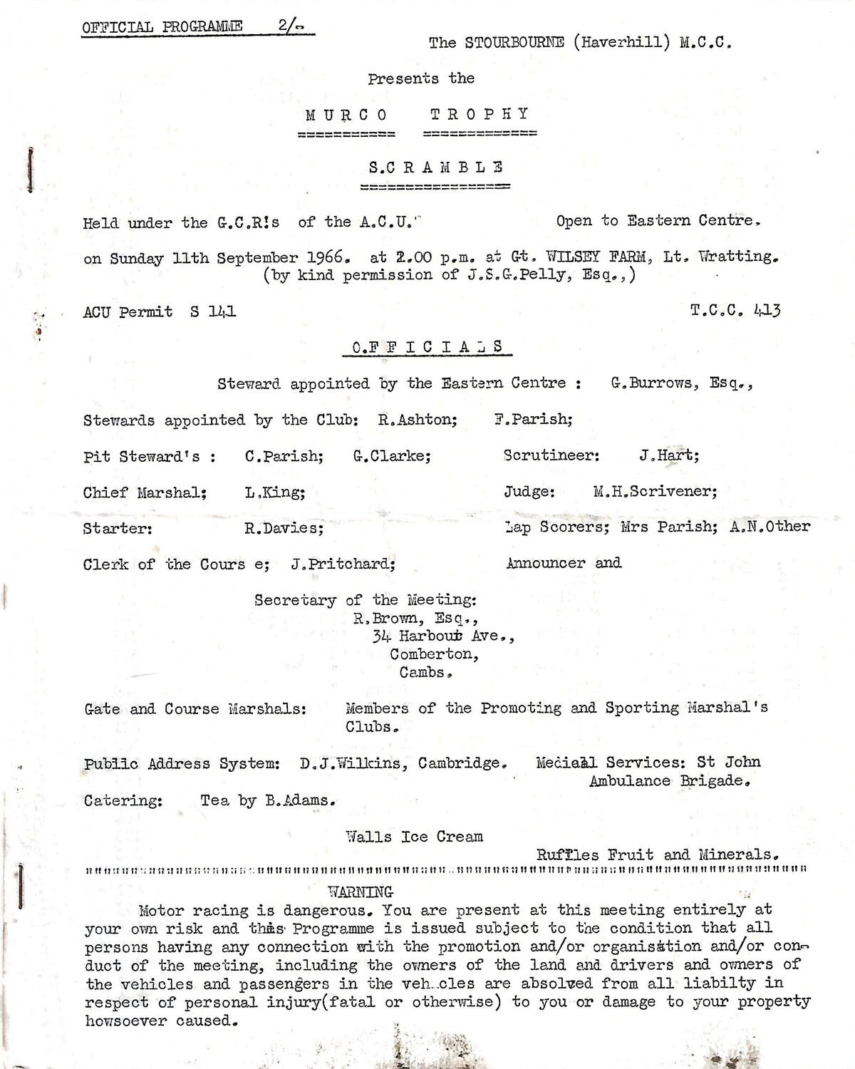 1966 Little Wratting The Stourbridge (Haverhill Motorcycle Club Murco Trophy (11/09/1966) Scramble Programme