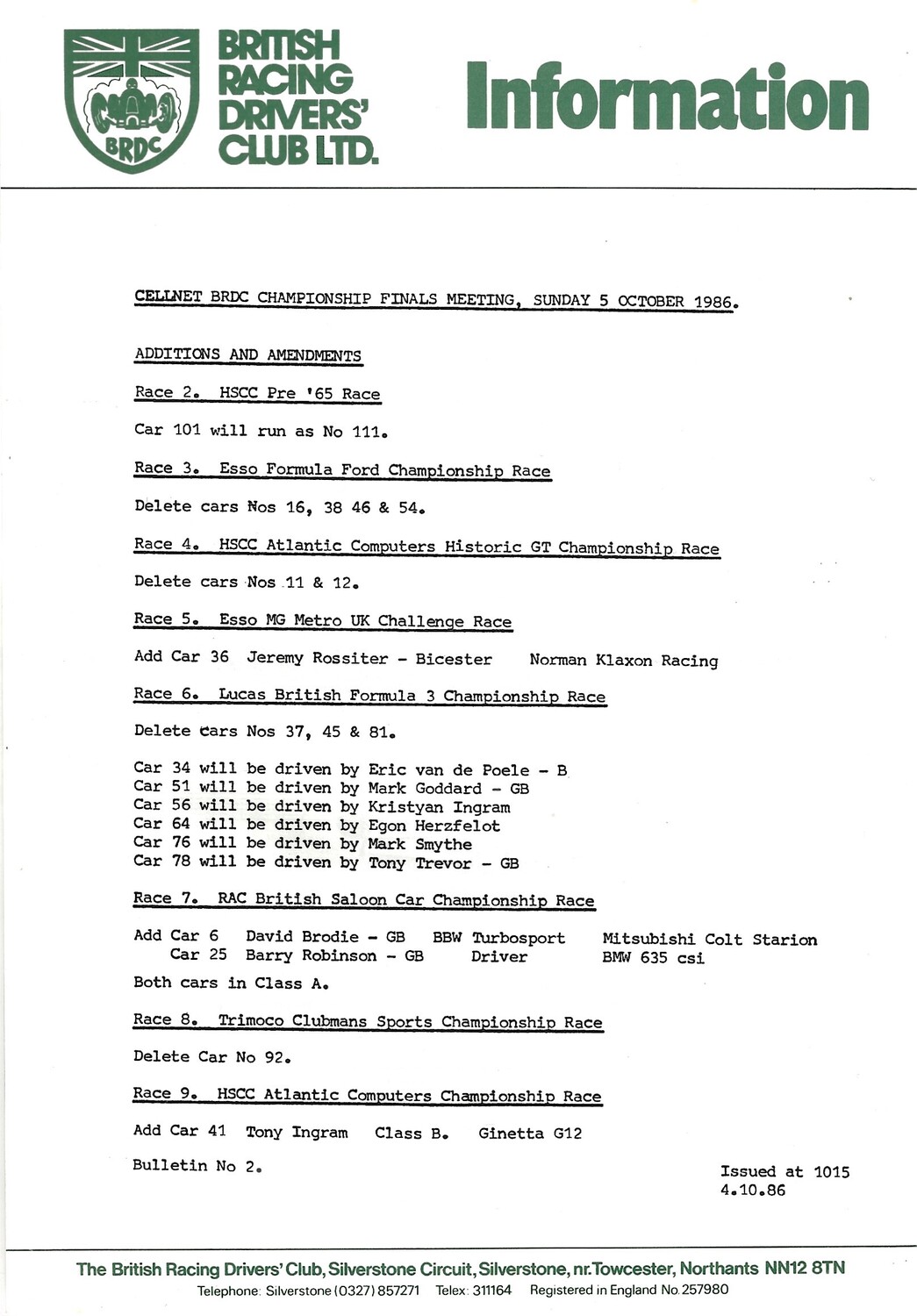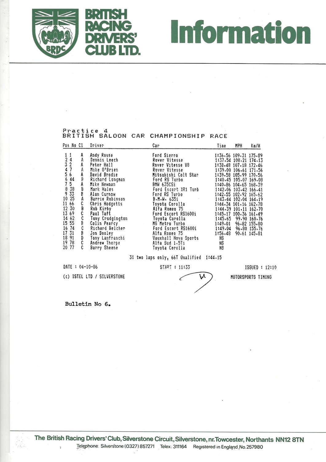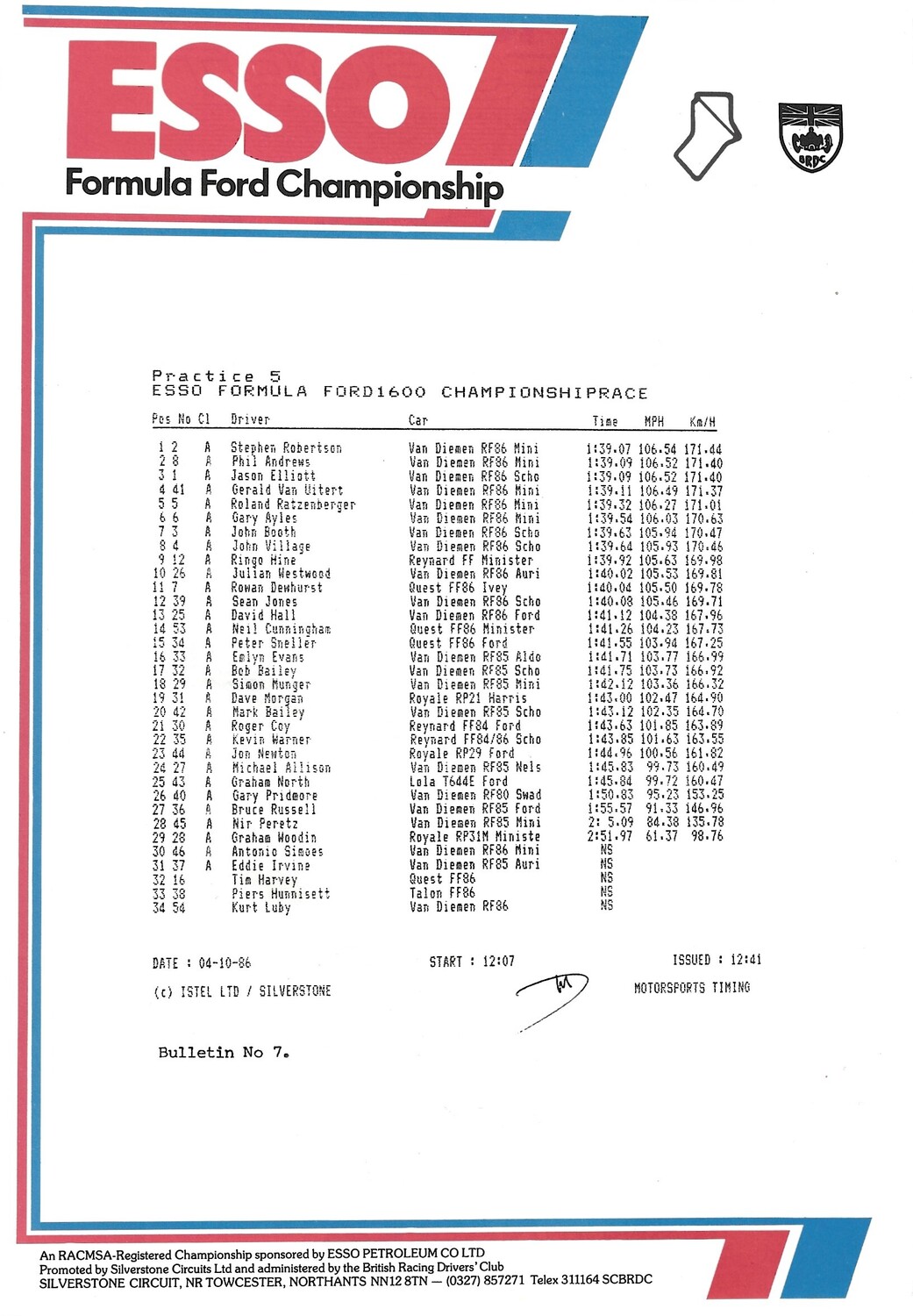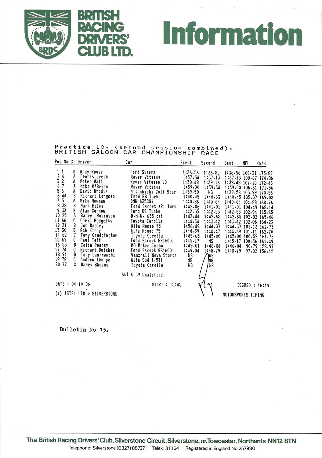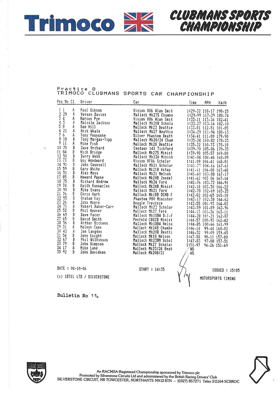 1986 Silverstone B.R.D.C Championship Finals Meeting (04-05/10/1986) Motor Racing Programme & Practice/Result Timing Sheets
