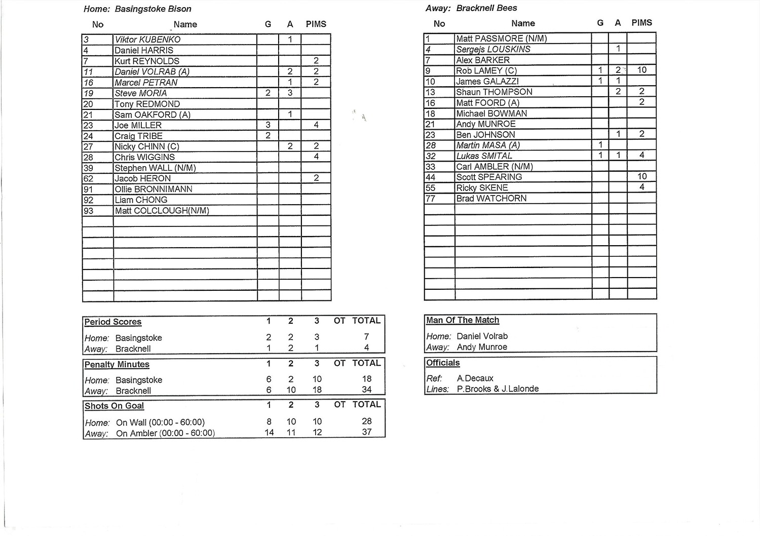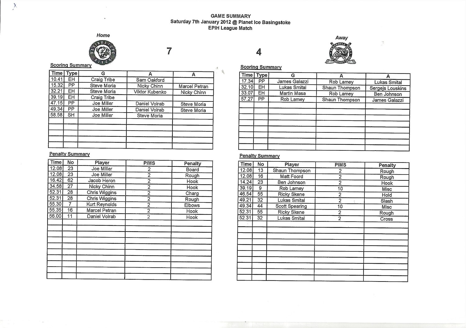 2011/12 Basingstoke Bison v Bracknell Bees (07/01/2012) EPIHL Ice Hockey League Game Summary Sheet