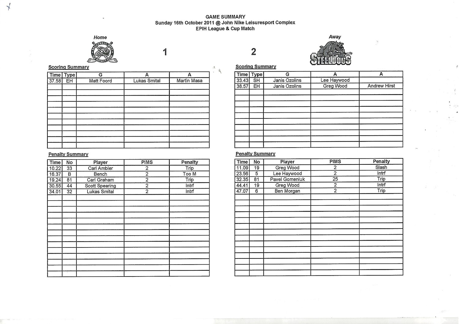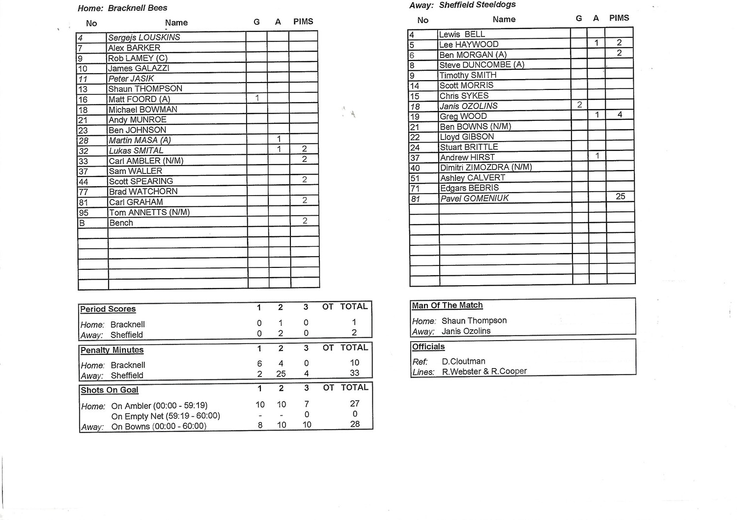 2011/12 Bracknell Bees v Sheffield Steeldogs (16/10/2011) EPIHL Ice Hockey League Game Summary Sheet