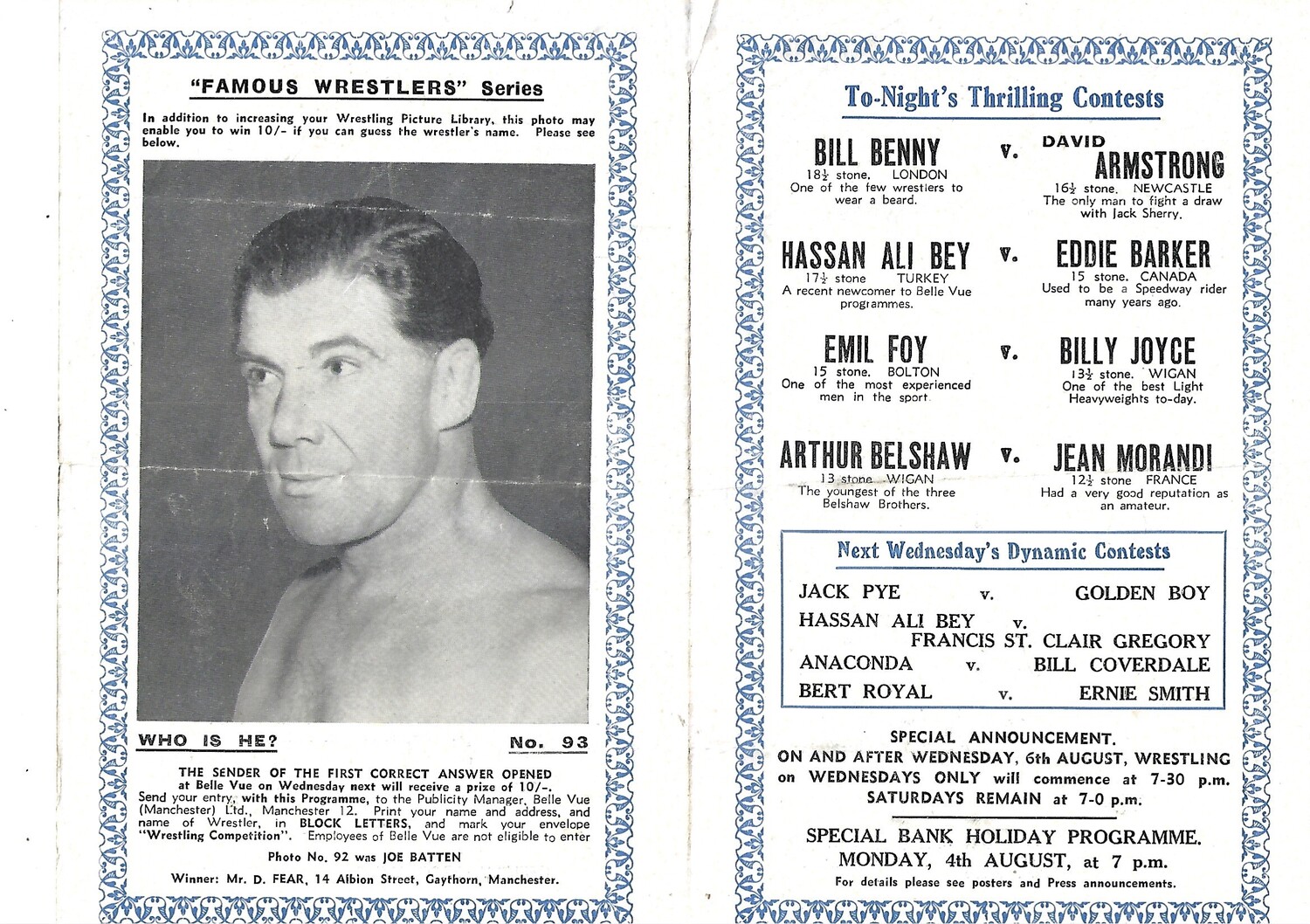 1952 Belle Vue (02/08/1952) Wresting Programme