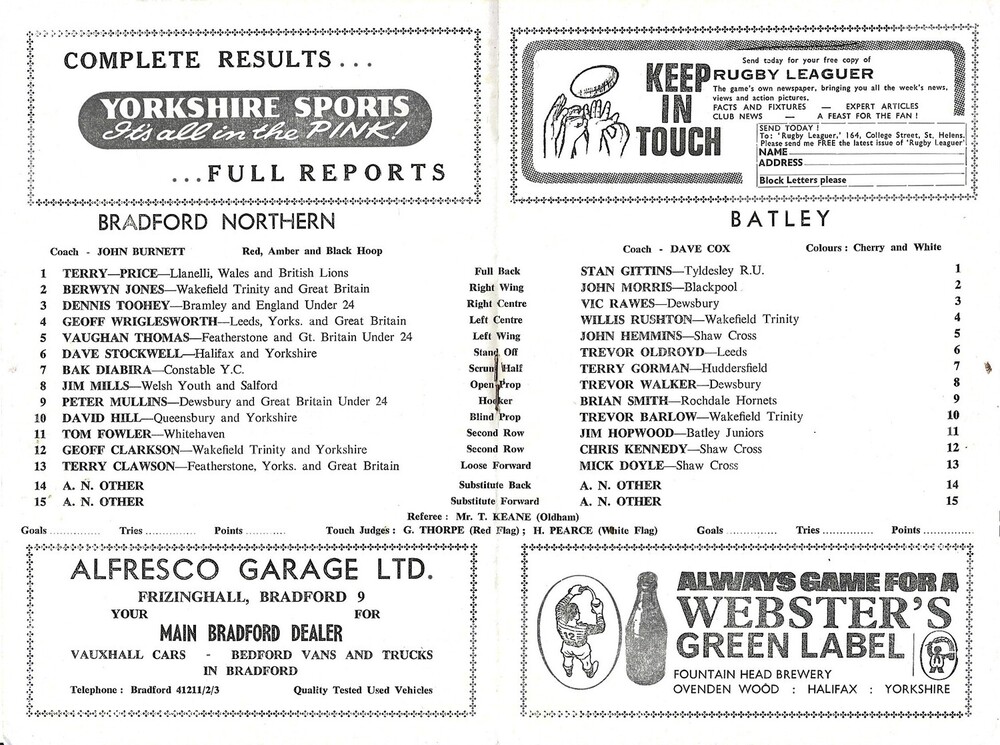 1968/69 Bradford Northern v Batley Rugby League Programme