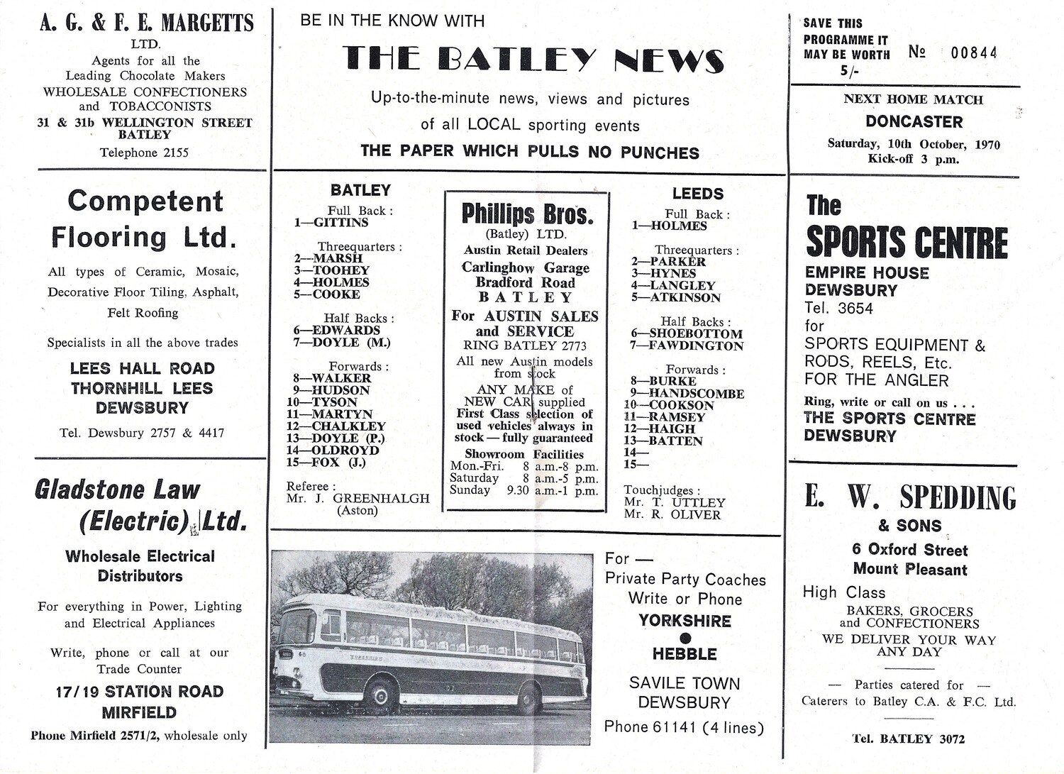 1970/71 Batley v Leeds (26/09/1970) Rugby League Programme