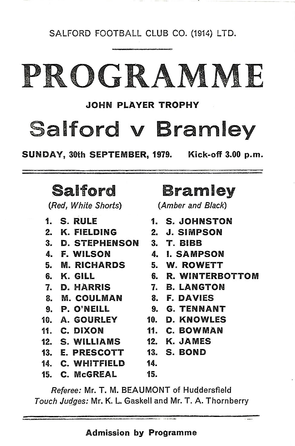 1979/80 Salford v Bramley John Player Trophy Rugby League Programme